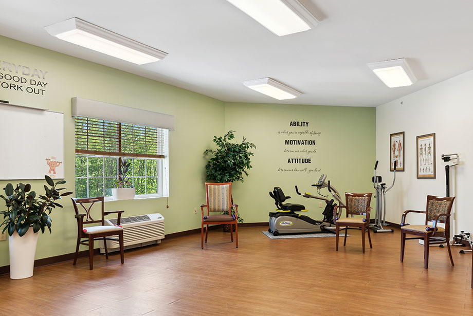 We prioritize fitness with ample amenities, including our exercise and rehabilitation room, complete with machines and free weights.